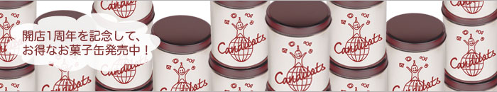 | 8月5日の開店1周年を記念して、キャンディロッツオリジナルのお菓子缶を期間限定販売致しております。
