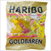ハリボーグミシリーズの元祖がこのゴールデンベア。中身は赤、黄色、緑…などのフルーツ味。ほかにはない固めの歯ごたえが人気です。ドイツでは国民的お菓子です。 |